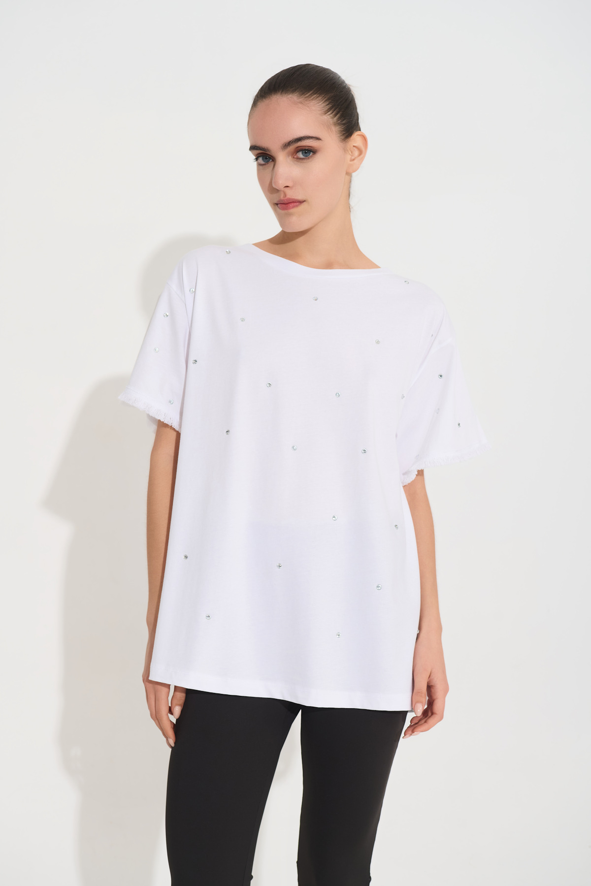 Oversized T-Shirt με Διάσπαρτα Στρας και Ξεφτισμένα Μανίκια
